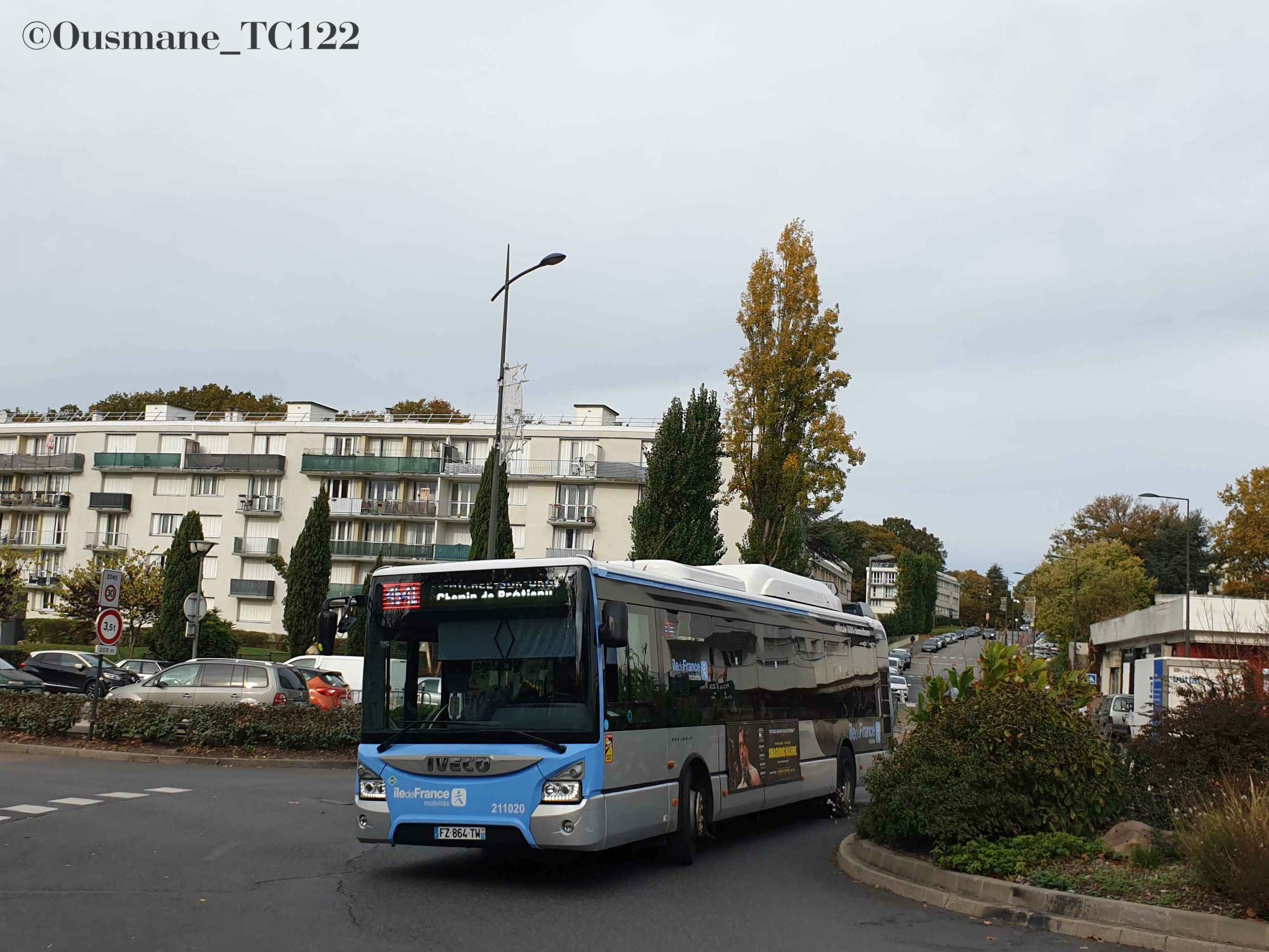 - L'Iveco Urbanway 12 GNV n°211020 photographié le 29 Octobre 2025 à Rue Berlioz (Saint-Michel-sur-Orge 91) sur la ligne 4541 de Transdev Coeur Essonne.